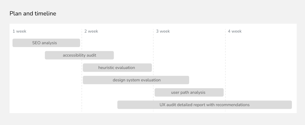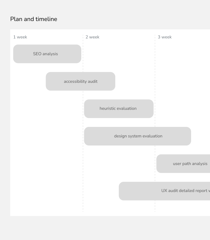 We present to you the plan and timeline of the audit of your website. It’s our way to ensure you understand what the audit will entail, how long it will take, and what the expected outcomes will be.